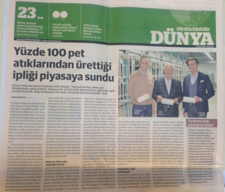 Ertona Yönetim Kurulu Başkanı Atilla Ilıman, "Dünya'da birkaç şirket geri dönüşümden iplik üretiyor. Almanya'da, Çin'de farklı ülkelerde pet şişelerden iplik üretimi denedik. Bilgi birikimimiz de vardı. Sonunda üretime başladık" dedi.